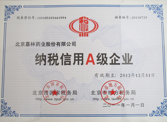 北京市朝陽(yáng)區(qū)國(guó)稅局納稅信用A級(jí)企業(yè)授牌儀式于2011年5月18日在北京市朝陽(yáng)區(qū)國(guó)家稅務(wù)局舉行,我公司再次榮獲由北京市國(guó)家地稅局和北京市地方稅務(wù)局聯(lián)合頒發(fā)的2011年度“納稅信用A級(jí)企業(yè)”榮譽(yù)稱號(hào)。授牌儀式上,朝陽(yáng)區(qū)國(guó)稅局領(lǐng)導(dǎo)宣布授牌企業(yè)名單,企業(yè)代表發(fā)言,明建華局長(zhǎng)作了講話。朝陽(yáng)區(qū)國(guó)稅局領(lǐng)導(dǎo)為嘉林藥業(yè)等80家企業(yè)進(jìn)行授牌。朝陽(yáng)區(qū)現(xiàn)有12.6萬(wàn)家企業(yè),獲得“納稅信用A級(jí)企業(yè)”的有215家。嘉林藥業(yè)一貫秉承誠(chéng)信經(jīng)營(yíng)、依法納稅的理念,自覺(jué)遵守稅收相關(guān)法律法規(guī),按時(shí)足額納稅,為打造守法經(jīng)營(yíng)、依法納稅的社會(huì)和諧氛圍做出了貢獻(xiàn)。